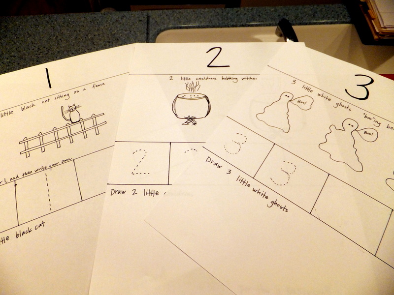 Prepping (making) the kids' Halloween songbooks (one of our school Halloween activities) after they were in bed: